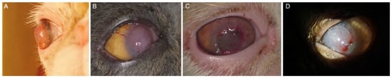 - Graham, K.L.; White, J.D.; Billson, F.M. Feline corneal sequestra: Outcome of corneoconjunctival transposition in 97 cats (109 eyes). J. Feline Med. Surg. 2017, 19, 710–716. [Google Scholar] [CrossRef] [PubMed]