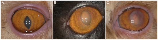 Grading of corneal healing after BioCorneaVetTM lamellar keratoplasty. (A) Grade 0, almost invisibility of corneal scarring and vessels; (B) Grade 1, minimal corneal stroma opacity and vascularization; (C) Grade 2, mild to moderate corneal stroma opacity and vascularization; (A–C) Case number: 3, 2 and 8.