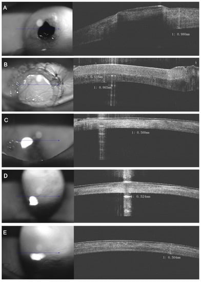 - Liu, Y.C.; Wittwer, V.V.; Yusoff, N.Z.M.; Lwin, C.N.; Seah, X.Y.; Mehta, J.S.; Seiler, T. Intraoperative Optical Coherence Tomography-Guided Femtosecond Laser-Assisted Deep Anterior Lamellar Keratoplasty. Cornea 2019, 38, 648–653. [Google Scholar] [CrossRef] [PubMed]