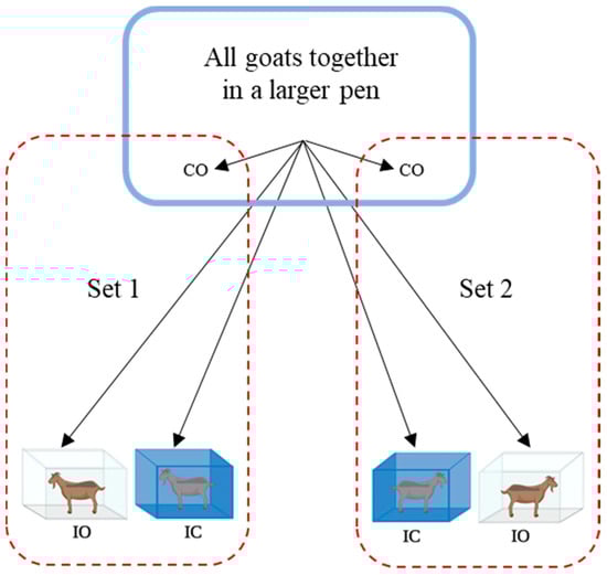 Treatments were applied simultaneously to two sets of animals (3 goats/set; Figure 1). In each set, three goats were allotted one each to IO, IC, and CO. Treatments were applied in this manner to 12 different sets of animals from the same fenced enclosure. A total of 36 goats were used in this study (n = 12 goats/TRT) on two consecutive days. Since goats were selected from the same fenced enclosure for assigning to treatment, individual animal was the experimental unit.