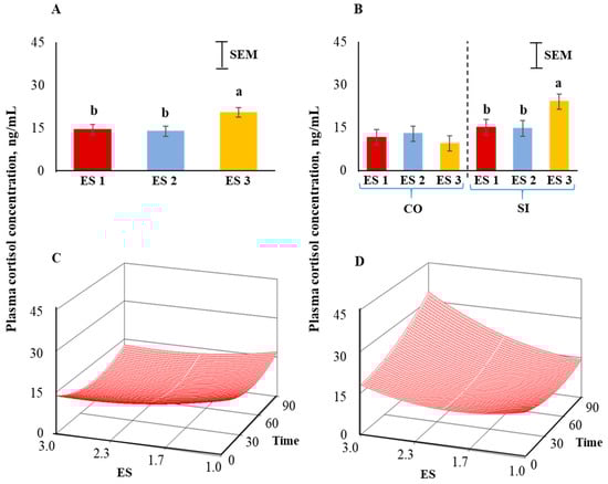 (A) Main effect of excitability score (ES) in goats (p < 0.05; n = 13 in ES 1, 11 in ES 2, 12 in ES 3), (B) ES × TRT interaction means (averaged across the 4 time periods), and response surface quadratic model representing the effect of ES over time on plasma cortisol concentrations in (C) CO and (D) SI treatment groups. ab Within a chart, bars with different letters differ significantly (p < 0.05) by pdiff procedure.