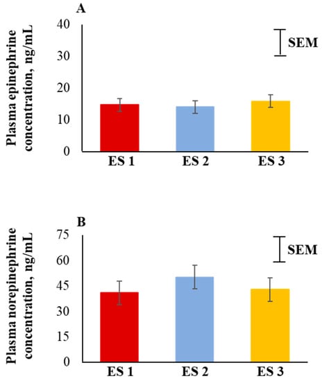 Plasma epinephrine and norepinephrine concentrations were not significantly influenced by ES (Figure 4A,B). There were also no significant ES × TRT, ES × Time, or three-way interaction effects for epinephrine and norepinephrine concentrations.