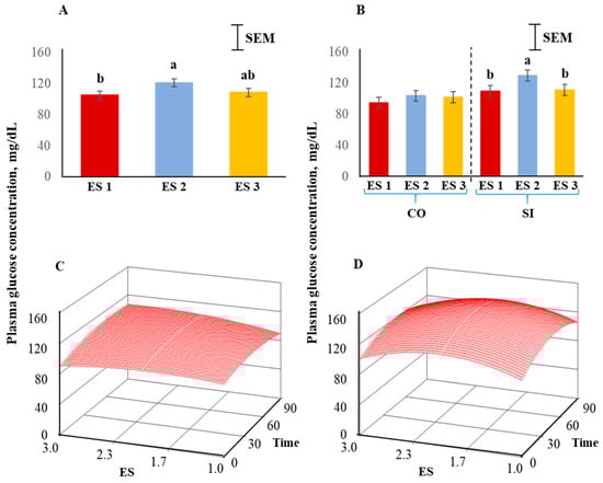 Plasma glucose concentrations were significantly influenced (p < 0.05) by ES (Figure 5A), with the concentrations being high in ES 2, low in ES 1, and intermediate in ES 3 goats, and this pattern was more prominent in the SI group than the CO group (Figure 5B). The response surfaces of CO and SI groups are shown in Figure 5C,D. The coefficient of variation for the SI group was 31.64 and the ANOVA for glucose is shown in Table 2. The lack of fit was not significant. The quadratic model for the SI group can be expressed as follows: