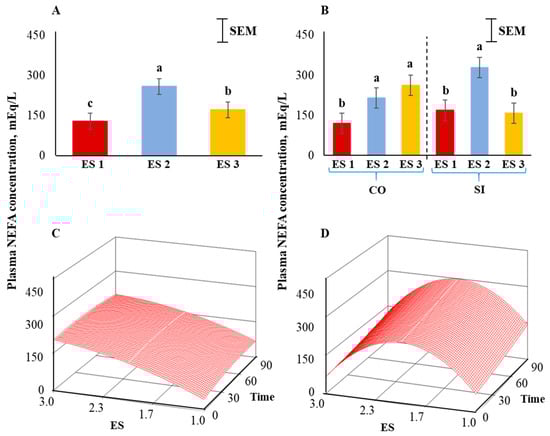Plasma NEFA concentrations were the highest in ES 2, lowest in ES 1, and intermediate in ES 3 goats (p < 0.01; Figure 6A). There was also a significant ES × TRT interaction (p < 0.01; Figure 6B). Application of the full quadratic model using response surface methodology revealed that the influence of ES on NEFA responses over time was not the same in the two TRT groups. To visualize this effect, the response surfaces of CO and SI groups are shown in Figure 6C,D. The coefficient of variation for the SI group was 60.89 and the ANOVA for NEFA is shown in Table 3. The lack of fit test was not significant. The quadratic model for the SI group can be expressed as follows: