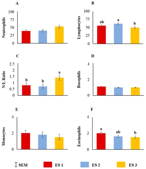 Neutrophil counts tended to be influenced by ES (p = 0.07; Figure 7A) and lymphocyte counts and N:L ratio were significantly influenced by ES (Figure 7B,C; p < 0.05). While basophil and monocyte counts were not affected by ES (Figure 7D,E), eosinophil counts were significantly influenced by ES (p < 0.05; Figure 7F).