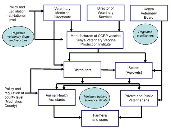 In Kenya, the state is responsible for the legislative frameworks that guide the manufacturing registration, distribution, and handling of the CCPP vaccine. An efficient regulatory authority is essential if quality standards are to be achieved and enforced. There are three government departments responsible for regulating vaccine development, distribution, and use: The Veterinary Medicine Directorate, the Directorate of Veterinary Services, and the Kenya Veterinary Board. The legislation part includes all policies that are related to or guide the use of vaccines, as well as the manufacture and distribution of vaccines both nationally and at county level. The Veterinary Medicine Directorate (VMD) regulates the manufacture, importation, exportation, registration, distribution, prescription and dispensing of veterinary medicines, drugs, and other animal health products in Kenya. The VMD operates at the national and county level. The VMD, therefore, oversees KEVEVAPI, which manufactures the CCPP vaccine. The Directorate of Veterinary Services (DVS) advises the national government on use of controlled vaccines and facilitates decisions on how and when to distribute vaccines. Counties make decisions on administration of these vaccines in their area of jurisdiction following advice provided by the DVS.