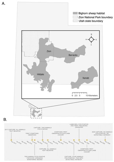 (A) Map of Zion bighorn habitat and subunits. (B) Timeline of disease events in the Zion population.