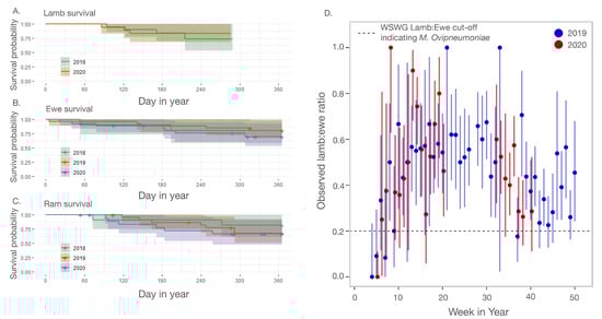 Animal survival throughout the outbreak. (A–C) Kaplan–Meier curves showing survival of lambs, ewes, and rams in the Zion population in each of the three study years. Cross-hatches indicate the dates of censoring events. Shaded regions extend to 95% confidence limits. Kaplan–Meier curves were built using the survdiff function in the survival package in R. (D) Weekly lamb:ewe ratios derived from field observations over the course of 2019 and 2020. Lines extend to 95% binomial confidence limits, in which the total number of trials was the total number of ewes observed over the course of the week. The dashed line shows the Wild Sheep Working Group (WSWG) cut-off for categorizing a population as experiencing problematic M. ovipneumoniae.