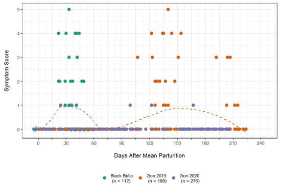 Symptom emergence patterns in Zion lambs in 2019 (orange) and 2020 (purple) in contrast to emergence in lambs from the Black Butte population (green) of Rocky Mountain bighorn sheep in 2014 (data from [16]). Lines are locally weighted least-squares lines fit to the Black Butte and Zion datasets. The same data, but aligned by day-in-year as opposed to lamb age, are presented in Figure A1.