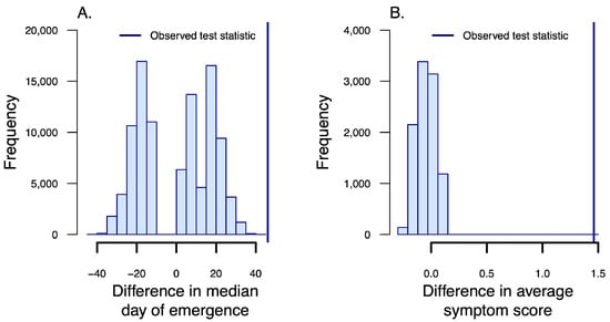 (A) Permutation distribution of the difference in median date of symptom emergence among Zion and Black Butte lambs in the first year following M. ovipneumoniae introduction. (B) Permutation distribution of the difference in average symptom score among Zion lambs in 2019 and 2020. The dashed vertical line shows the observed difference relative to the randomization distribution in each case.