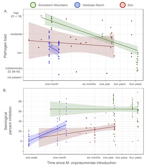 Before the westward expansion of European settlers and their old-world domestic sheep and goats in the nineteenth century, bighorn sheep (Ovis canadensis) occupied much of the mountain and rugged desert habitat in western North America [1]. As the European population in the West increased, native sheep populations declined precipitously due to habitat fragmentation and degradation, unregulated hunting, and disease [1]. While bighorn sheep are susceptible to many different pathogens [2], Mycoplasma ovipneumoniae is of particular concern because of its role in polymicrobial pneumonia [3,4,5]. M. ovipneumoniae invades the host’s upper respiratory tract, potentially impeding the motion of the mucociliary escalator [6,7] and allowing for downward invasion of normally commensal upper respiratory microflora. Those microflora can produce a polymicrobial pneumonia in the lower respiratory tract [8], which regularly produces high levels of mortality in bighorn sheep. M. ovipneumoniae-associated epizootics in bighorn sheep populations frequently result in all age die-offs, and a population can suffer from years of reduced recruitment after a pathogen introduction event [9,10,11]. Domestic sheep and goats can carry M. ovipneumoniae asymptomatically, and both of these species, along with other bighorns, can transmit the pathogen to naive bighorn sheep populations [12,13]. Following introduction, chronic carriage by adult bighorns can lead to annual pulses of pneumonia among susceptible juveniles [14], producing extended periods of low recruitment that can stymie population growth [11].