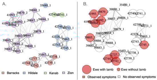 Metrics describing the Zion social networks are presented in Table 2. The Zion population broke into four distinct communities (Figure 6A), and there was very little movement among communities by ewes (rams occasionally moved among units especially during and just prior to rut). Symptoms appeared to cluster within a few particular units, and showed evidence of a non-random distribution within the system (Figure 6B), but assortativity of symptoms was not statistically different from zero (assortativity coefficient according to symptom presence on the weighted graph = −0.03). Thus, the evidence that M. ovipneumoniae may have been “socially trapped” in particular ewe groups [30,31,32] remains marginal in this case.