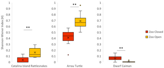 Boxplot for all significant differences within a species in the Shannon–Wiener Index (H) when the zoo was closed vs. open. For H, lower values indicate a lower variety of behaviors. The mean of each condition is represented by an “×”. Significant differences of Pr > |S-Mean| equal to 0.01 or below are indicated with a double asterisk (**).
