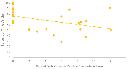 Scatterplot with a trendline comparing the daily rate of visitor-glass interaction and the daily percent of time visible for the group of European glass lizards. Each point represents a single day for the group.