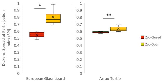 Boxplot for all significant differences within a species in the Dickens’ Spread of Participation Index (SPI) when the zoo was closed vs. open. For SPI, lower values mean more even space use. The mean of each condition is represented by an “×” and all outliers are indicated by circles. Significant differences (Pr > |S-Mean| below 0.05) are indicated with an asterisk (*), and Pr > |S-Mean| of 0.01 or below are indicated with a double asterisk (**).