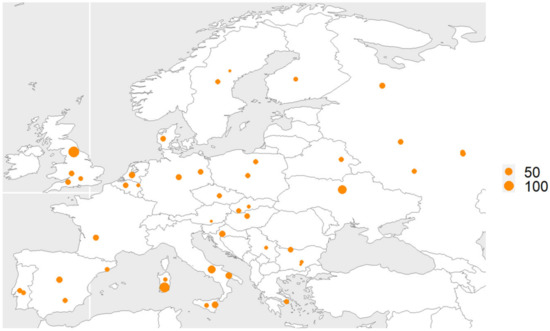 Regional distribution map of 1098 individual European pigs. Refer to the data source article for specific group geographic divisions [22,23]. These dots indicate the distribution, source and quantity of samples.