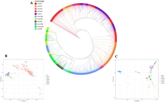 According to the classification of the habitat large geographical plate (11 redefined regions) of breeds (Figure 2A, Table S2), the phylogenetic relationship of all European individuals revealed large-scale exchange of genetic material. However, a large genetic divergence exists between the DP and WB populations in Europe.