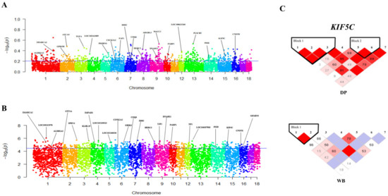 Genome-wide selection scan for SNPs in European WB and DP by using pairwise fixation index (FST) and Tajima’s D. (A) Manhattan map of FST between groups; (B) Manhattan map of Tajima’s D between groups; (C) Result of genetic linkage of KIF5C by linkage disequilibrium.