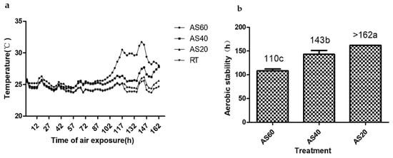 Dynamic changes in temperatures (a) and hours of aerobic stability (b) of the TMR silages during air exposure (bars indicate the standard errors of the means). Values with different letters show significant differences among the treatments (p < 0.05). AS60, TMR containing 60% alfalfa silage (DM); AS40, TMR containing 40% alfalfa silage (DM); AS20, TMR containing 20% alfalfa silage (DM); RT, room temperature.