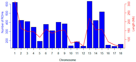 Frequency distribution of ROHs per chromosome (blue bars) and changes in the length of each chromosome (red lines).