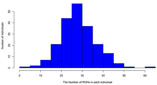 As shown in Figure 4, the number of ROHs on autosomes is related to the increase in the chromosome length; the number of ROHs on each chromosome was the largest on SSC 13 (632), whereas the number of ROHs on each chromosome was the smallest on SSC 17 (139). The total number of ROHs in each individual varied from 3 to 62, with an average of 28.59 ± 8.74 (Supplementary Table S5), and most individuals had 25 to 30 ROHs (Figure 5). In this population, FROH for each individual was calculated from the detected ROHs (Supplementary Table S5), and the average inbreeding coefficient of this population was 0.11 ± 0.05.