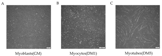MuSC differentiation program; phase-contrast micrographs depicting cultures of goat MuSCs in proliferating conditions (growth medium (GM)) (A), in early myogenesis after 24 h in differentiation medium (Myocytes, DM1) (B), and in late myogenesis, including myotubes, after 5 days in DM (Myotubes, DM5) (C).
