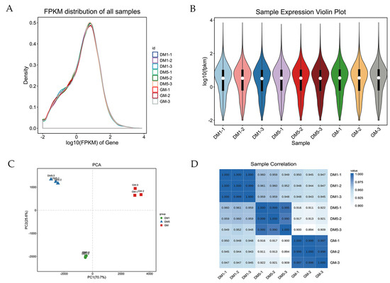 Expression analysis of the mRNA. (A) The density distribution of mRNAs was according to log10 (FPKM); (B) the nine sample expressions of GM−1, GM−2, GM−3, DM1−1, DM1−2, DM1−3, DM5−1, DM5−2, of DM5−3 in a violin plot, which was replaced by log10(FPKM); (C) the PCA analysis of 9 samples; (D) the sample relationship cluster analysis.