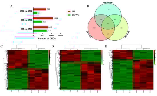Based on our differential analysis, DEGs were defined as genes that were differentially expressed between stages using FDR < 0.05 and Fold change > 2 as cut-offs. Noticeably, we observed more upregulated DEGs than downregulated DEGs during MuSC differentiation (Figure 3A and Supplementary Table S1). A total of 12,756 differentially expressed genes were identified, and 1560 DEGs were identified when comparing the GM and DM1 groups, among which 813 showed increased expression and 747 showed decreased expression. Moreover, the number of DEGs detected from the GM and DM5 comparison groups was 1597, the number of upregulated genes was 1097, and the number of downregulated genes was 500. In addition, 959 DEGs were identified in the DM1 and DM5 comparison groups, and 722 DEGs were upregulated and 237 DEGs were downregulated. We next performed unsupervised clustering analysis according to the temporal gene expression profile in order to reveal the similarities between various temporal phases (Figure 3B–D). The Venn diagram in Figure 3E depicts the common and distinct DEGs expressed in different phases (Figure 3E). We observed 202 shared genes in the intersection, the expression levels of which are summarized in Supplementary Table S2.