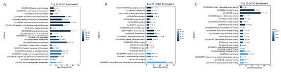 GO enrichment analysis of DM1 vs. DM5. (A) The top 20 significance terms of Biological Process in DM1 vs. DM5; (B) the top 20 significance terms of Cellular Component in DM1 vs. DM5; (C) the top 20 significance terms of Molecular Function in DM1 vs. DM5.