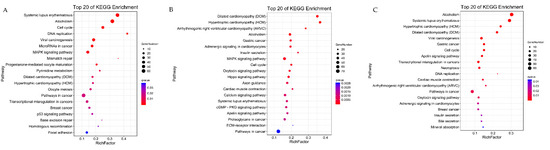Bubble plot of the top 20 significance pathways of KEGG enrichment. (A) The top 20 significance pathways in GM vs. DM1; (B) the top 20 significance pathways in GM vs. DM5; (C) the top 20 significance pathways in DM1 vs. DM5. The color of the circle represents the q value, which is adjusted to the p-value by multiple hypothesis testing. The size of the circle indicates the number of annotated differentially expressed genes.