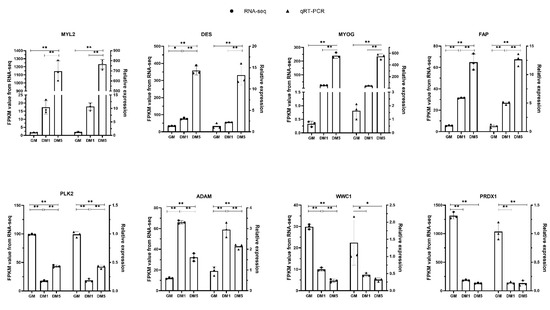 In order to validate the high-throughput RNA-seq results, we selected and examined the expression levels of eight DEGs (MYL2, DES, MYOG, FAP, PLK2, ADAM, WWC1, PRDX1) by qRT-PCR. The results showed that the expression patterns of these eight genes nicely replicated the expression trends calculated from the RNA-seq data, which confirmed the reliability of the sequencing data (Figure 7).
