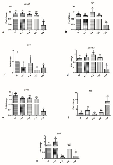Relative expression levels of FA synthesis and β-oxidation genes (a) evovl; (b) cpt, (c) acc, (d) acadvl (e) acox (f) fas (g) scd. The values represent the mean ± standard errors (n = 6). The transcript level from each gene is calculated relative to the other genes’ levels using the raw cycle threshold value for each gene and then normalized against ef1a. The values shown are the fold induction changes relative to the average Ct value for all genes. PL1-low levels of phospholipids; PL2-high level of phospholipids; TG1-low levels of triglycerides; TG2-high levels of triglycerides. The different letters present significant (p < 0.05) differences among diets.