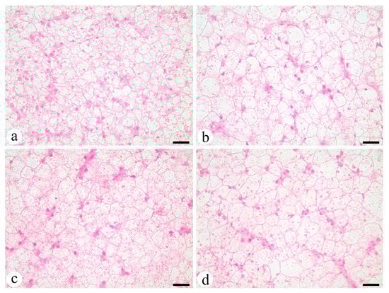 Morphologies of the hepatocytes of dusky grouper juveniles after the 8-week feeding trial. (a) PL1 group; (b) PL2 group; (c) TG1 group; (d) TG2 group. Bars 25 µm.