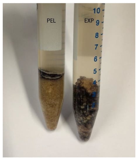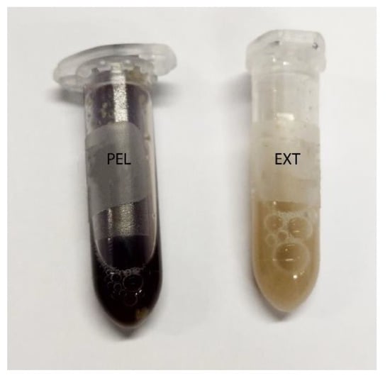 Centrifuged samples of the diets, showing a narrow blue band in PEL (on the left) and staining throughout the complete sediment in EXT (on the right).