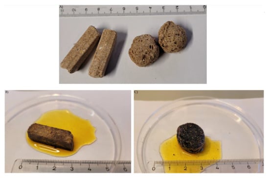 Diets. (A) Intact pellets (PEL) and extruded kibbles (EXT); (B) Intact pellet stained with Lugol´s iodine; (C) Intact extruded kibble stained with Lugol´s iodine.
