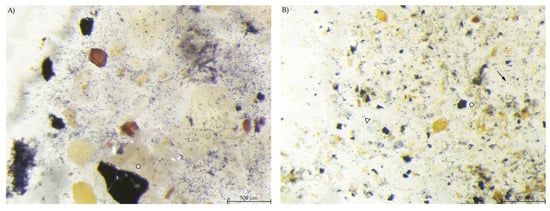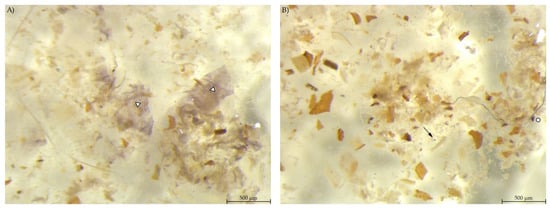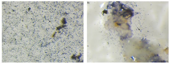 Stomach content samples stained with Lugol’s iodine. (A) PEL with compact, round stained starch particles; (B) EXT with round and irregular stained particles and a blue haze in the fluid phase (stereomicroscopy, 25 ×; ○ marking larger starch fragments, ↓ marking small round particles, ∆ marking blue haze).