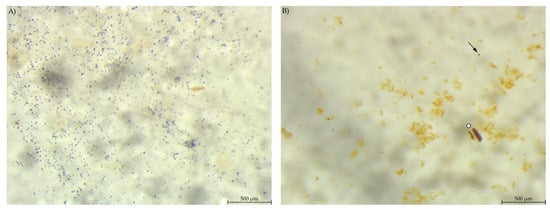 The chyme and faeces samples were mixed with distilled water (1:5) for pH measurement (pH data reported previously [13]). After pH measurement, 1mL of Lugol´s iodine was added, and the samples were centrifuged (3× g, 5 min; Eppendorf 5810R, Eppendorf AG, Hamburg, Germany). The phase of sediment stained dark blue with Lugol´s iodine (Figure 1) was used to generate a subsample of approximately 0.25–0.5 mL (depending on the total amount) that was transferred to a plastic petri dish (Sarstedt AG & Co. KG, Nümbrecht, Germany) and examined microscopically. The routine magnifications we used were25 × and40 ×. For publication, the photographs were edited for light intensity in Adobe Photoshop® (Adobe Inc., San Jose, CA, USA) and markers inserted in Adobe Illustrator® (Adobe Inc., San Jose, CA, USA).
