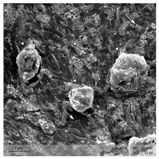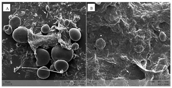 Starch particles in the stomach content of group (A) PEL, and (B) EXT; note the rod-shaped bacteria in the surroundings of the starch particles. (Scanning electron microscopy; ↓ indicating bacteria, ∆ marking irregularly shaped starch particles in B).