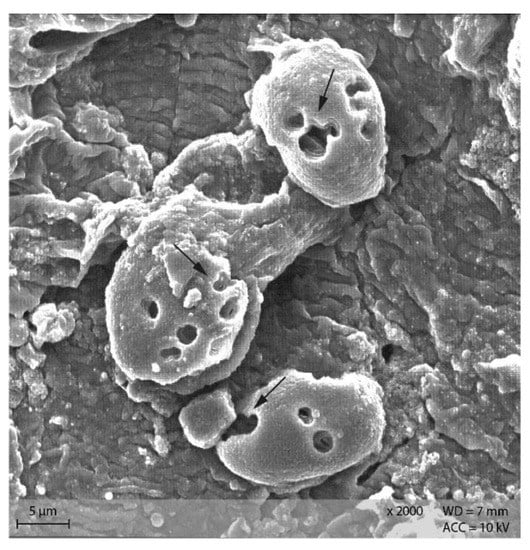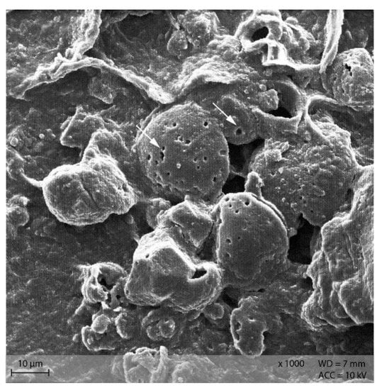 Starch granules with small pinholes, indicating the beginning of enzymatic degradation in the small intestine. Example from diet PEL (Scanning electron microscopy; ↓ indicating pinholes).