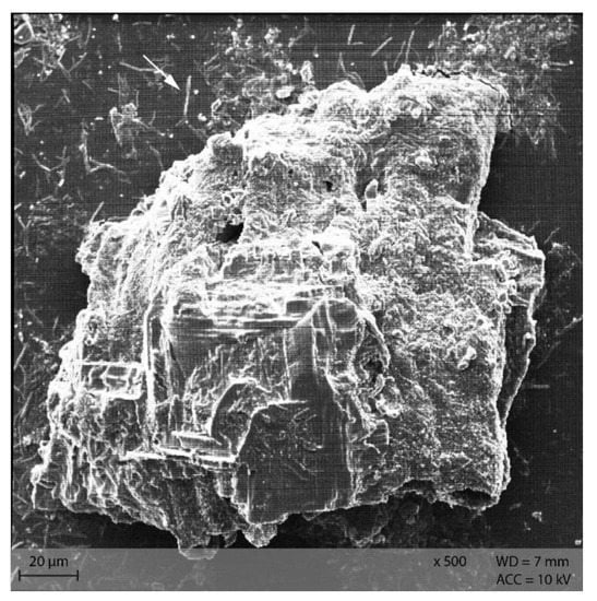 Caecum content sample from diet group EXT showing a large, crystalline shape (Scanning electron microscopy, ↓ indicating bacteria in the background).
