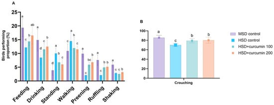 Effect of curcumin on the proportion (%) of birds performing different behavioural patterns (A). Feeding, Drinking, Standing, Walking, Preening, Ruffling and Shaking. (B). Crouching reared under high stocking density. The data shown are the mean and standard deviation. a–d Means bearing different superscript letters within the same row are significantly different (p < 0.05). MSD = low stocking density, HSD = high stocking density.