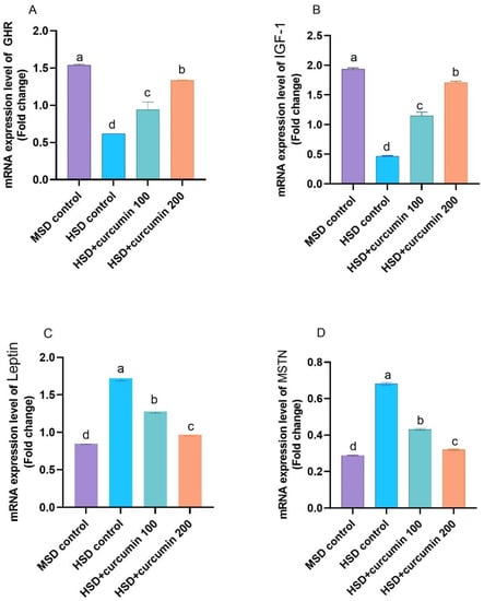 Muscular growth is controlled by various elements, including GHR, IGF-1, MSTN, and leptin. IGF-1 contributes to the growth mechanism, and numerous researchers confirmed that IGF-1 controls the growth of skeletal muscle, which is produced under the GH and GHR control []. IGF-1 stimulates skeletal muscle hypertrophy and inhibits muscles atrophy []. Leptin plays a critical role in regulating the growth of muscles, and it is produced by adipocytes to signal the brain to decrease the intake of food and improve the expenditure of energy. Hence, it harms growth []. MSTN is considered a crucial element for the growth and improvement of muscle, and it also performs as an adverse regulator of muscular development. Before birth, MSTN negatively impacts muscular enlargement, and MSTN inhibits muscle hypertrophy in broilers []. In existing work, expression values of mRNA of IGF-1 and GHR in the liver samples were markedly reduced compared to the other groups. However, the expression of mRNA values of MSTN and leptin at HSD was enhanced markedly. Those findings propose that HSD could impact muscular differentiation and hypertrophy by controlling the GHR, IGF-I, leptin, and MSTN gene expression. On the contrary, curcumin supplementation in the diet of HSD reared broilers up-regulated the growth-enhancing genes expression (GHR and IGF-1) while it down-regulated the expression of the growth-inhibitory genes (leptin and MSTN), which might indicate a growth-promoting effect of curcumin [].