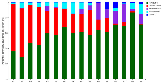 Abundance of the different phyla (%) in fecal florae. N: Normal group (NG); T: Test group (TG). Numbers 1–8 represent the sampling times of 12 h, 24 h, 36 h, 48 h, 72 h, 5 d, 10 d, and 30 d, respectively. Time relative to start of the study.