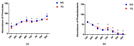 Abundance of the different phyla (%) in calf rectal flora. ‘*’ indicates a significant difference. NG: Normal group; TG: Test group; 12 h, 24 h, 36 h, 48 h, 72 h, 5 d, 10 d, and 30 d, represent the sampling times, respectively. Time relative to start of the study.
