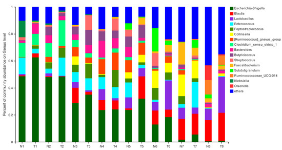 Abundance of different genera (%) in calf rectal flora. N: Normal group (NG); T: Test group (TG). Numbers 1–8 represent the sampling times of 12 h, 24 h, 36 h, 48 h, 72 h, 5 d, 10 d, and 30 d, respectively. Time relative to start of the study.