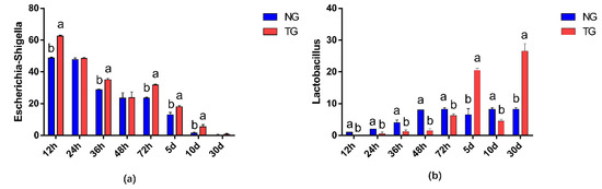 The effect of pathogenic E. coli O1 on the abundance of different genera in calf rectal feces is shown in Figure 3 and Figure 4. The top 10 dominant genera with relative abundance in the TG and NG were Escherichia-Shigella, Blautia, Lactobacillus, Enterococcus, Peptostreptococcus, Collinsella, Ruminococcus-gnavus-group, Clostridium sensu stricto 1, Bacteroides, and Butyricicoccus. Among them, there were two types of bacteria with obvious differences. Compared with that in the NG, TG Escherichia-Shigella significantly increased (p < 0.05) and Lactobacillus was significantly decreased in the early stage and significantly increased in the later stage (p < 0.05). The relative abundance of Escherichia-Shigella decreased gradually with calf age, while that of Lactobacillus increased gradually with calf age.