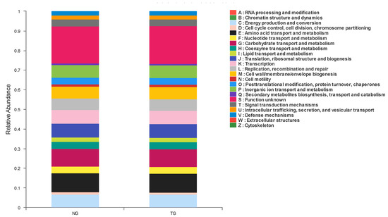 According to the functional classification of proteins predicted by COG, 23 groups were obtained, as shown in Figure 5. In these COG classifications, the groups with the highest abundance in calf feces from the TG and NG mainly included amino acid transport and metabolism, carbohydrate transport and metabolism, transcription, translation, ribosomal structure and biogenesis, and energy production and conversion, among others. The only statistically significant factor in COG prediction function abundance between the NG and TG was transcription, which decreased after calf diarrhea was induced by pathogenic E. coli.