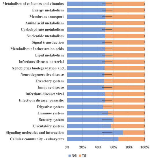 Kyoto Encyclopedia of Genes and Genomes (KEGG) metabolic pathway analysis. NG: Normal group; TG: Test group. The error bars indicate positive and negative deviations.