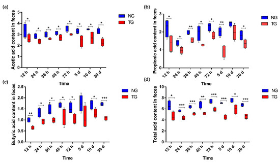 Comparison column chart of SCFA differences: (a) acetic acid; (b) propionic acid; (c) butyric acid; (d) total acid. The units for the measures of the SCFAs are mmol/kg. * 0.01< p ≤ 0.05, ** 0.001 < p ≤ 0.01, *** p ≤ 0.001. NG: Normal group; TG: Test group; 12 h, 24 h, 36 h, 48 h, 72 h, 5 d, 10 d, and 30 d represent the sampling times, respectively. Time relative to start of the study.