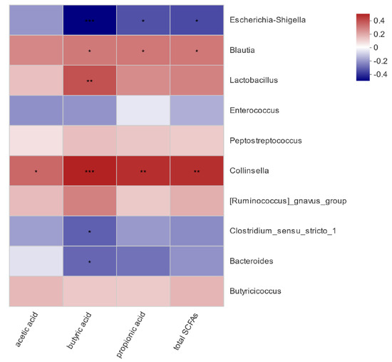Heat map of correlation analysis between rectal microorganisms and short-chain fatty acids. * 0.01 < p ≤ 0.05, ** 0.001 < p ≤ 0.01, *** p ≤ 0.001.
